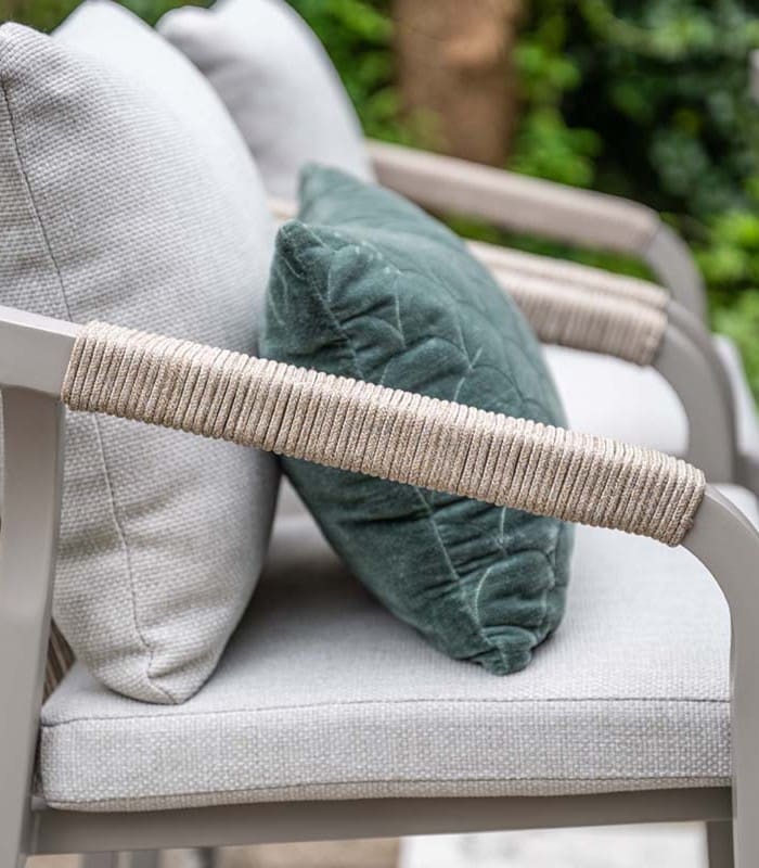 The tall table with 4 chairs adds a chic contemporary touch to your outdoor space. The chairs are finished with a on trend hand woven rope in a mid grey. The rope is made with a rubber core, chosen for its durability, weather resistance and colour stability. The taupe cushions aren’t only stylish, but extremely comfy as well as weather resistant.